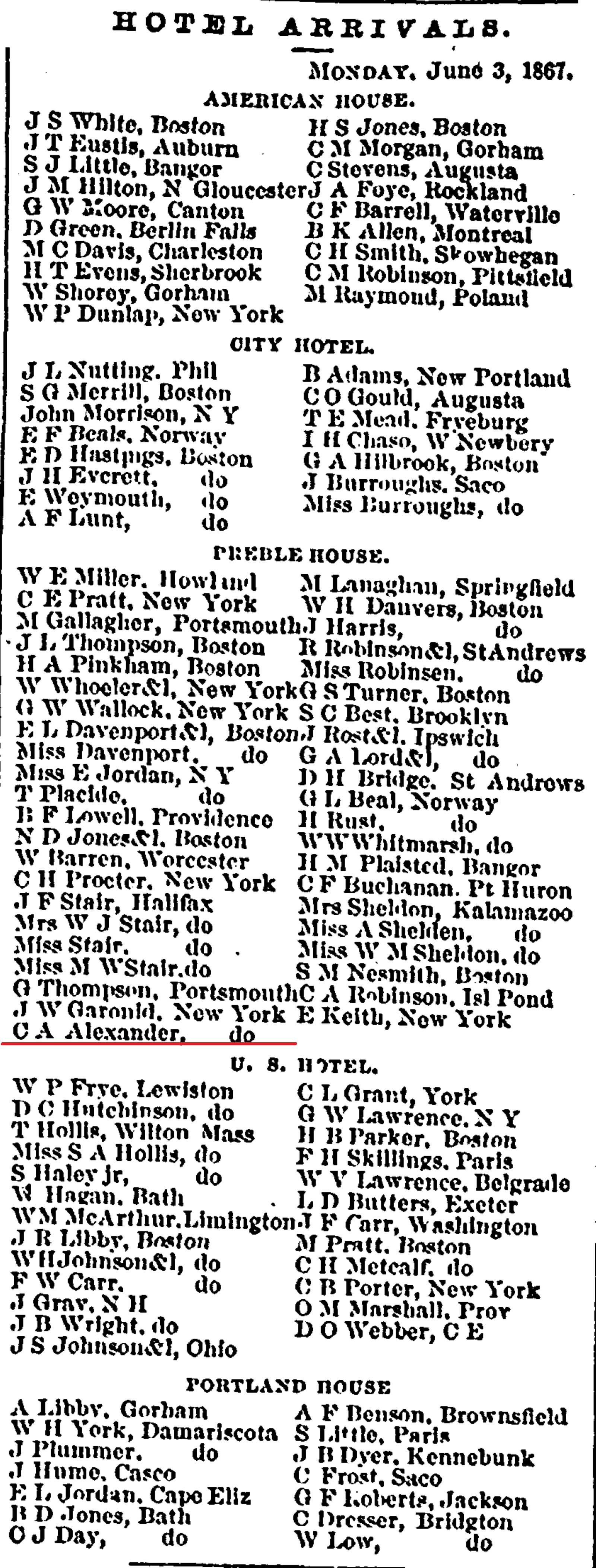 Perhaps it was the embarrassment. Maybe it was social scorn or business issues. For whatever reason, Charles Alexander left Portland and moved to New York City in 1863. He continued to practice architecture and would visit Portland at various times as would be noted in the local papers. He also put an odd advertisement for hair tonic in the Daily Eastern Argus for several weeks in 1865 wherein he stated he was residing on Vaughan Street.
