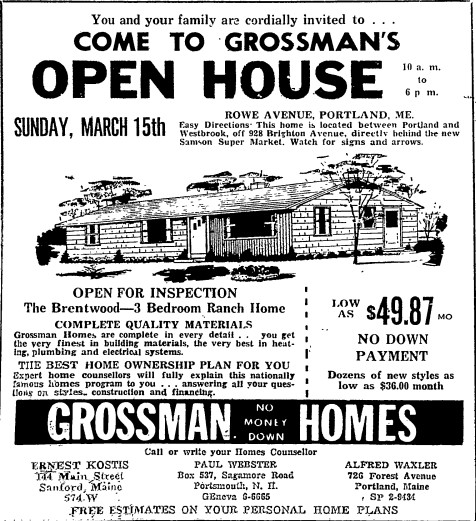 Alfred Waxler was the Maine & New Hampshire representative for Grossman’s Quality Crafted Homes. He worked out of the company’s store at 726 Forest Avenue. Alfred was born in 1925 and served in WWII. He had married Francis Lerman although I cannot determine when. They lived at 165 Congress until 1956 when they sold it to Jennie Roy. Jennie Roy only owned it until 1959 and I am not sure she lived here. An interesting note on her FamilySearch.Com listing states: