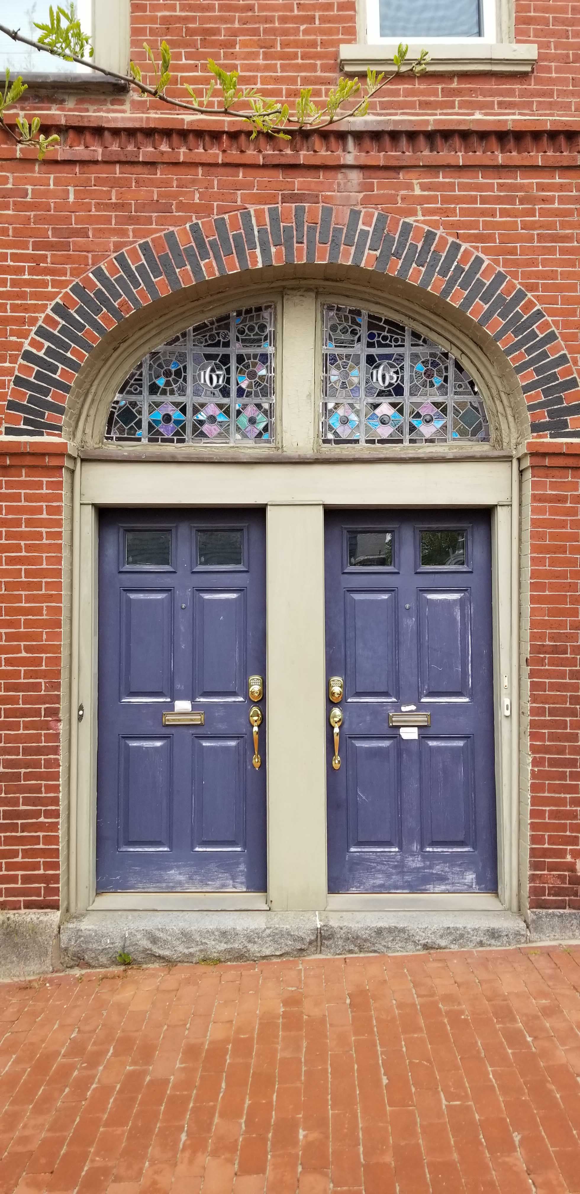 The stained glass above the entries and the primary first-floor window are attractive and quite unique. Whether they are original or not is not clear but it is obvious they were there in 1924 as seen in the tax photo. Also notable in the 1924 photo is the bay window of the 2nd floor where there is now a flat window under the arch. I note that the brick arch above the entries has been painted since 2016.