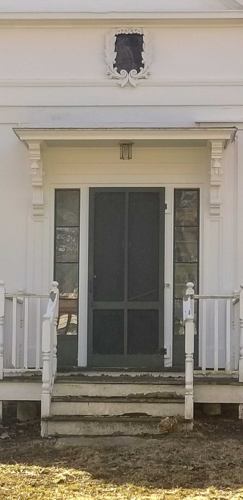 The main block is a study in ‘Carpenter Greek Revival’ style. The flat wall is overlayed with battens arranged symmetrically but for those at either side of the windows. At the corners, a series of moldings work to create a pilaster supporting a complete entablature. In that entablature is set a series of rectangular windows surrounded by carved garland wreathes. The pediment is closed and molded in the Greek Revival mode. Placed in the pediment is a 6 over 6 rectangular window that is capped with a Gothic arched molding that may have held a window originally. It definitely had shutters as can be seen in the 1924 tax photo.