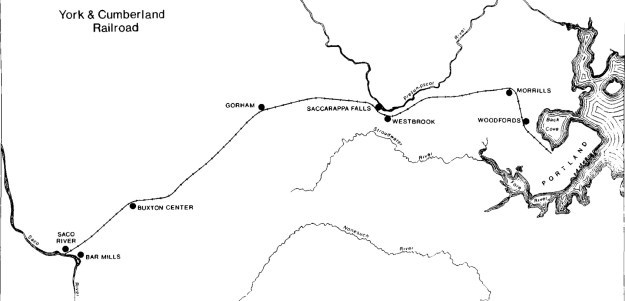 Map of the York & Cumberland County Railroad. From ‘The Rise and Fall of the York and Cumberland Railroad by William Curtis Pierce. Maine History 1.1.1976. Portland Public Library Digital Commons