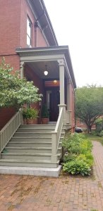 151 Pine Street is 32′ wide on the street and 46′ deep. It is 2 stories tall with a third in the garret. Constructed of brick, it is quite understated for Fassett’s work in that time. The details are restrained. A simple band molding marks the line of the first and second floors. Another pair mark the bottom of the entablature and cornice. Rosettes and a dentil molding accent the entablature with brackets adding to the details.