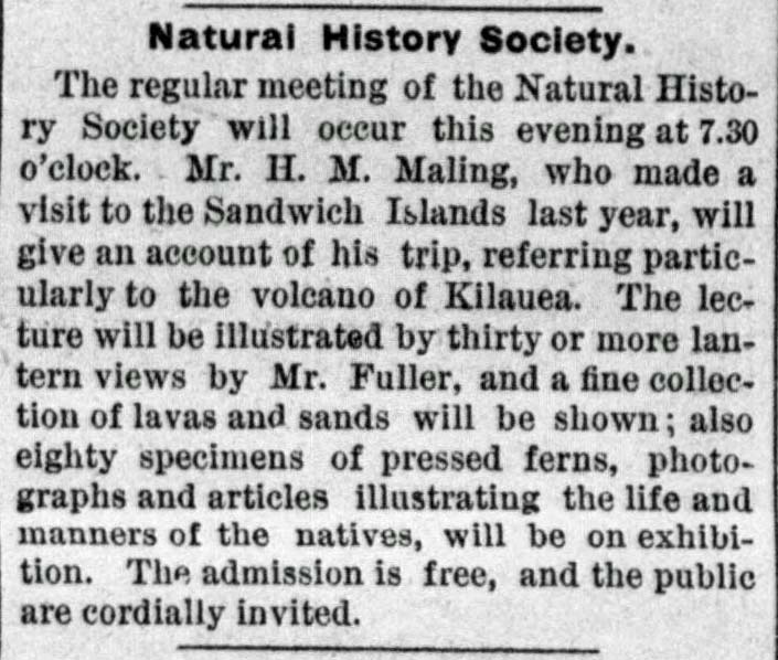 In 1886 Henry, and we can assume Ernestine, travelled to the Sandwich Islands, now Hawaii. In the mid-1880s, a trip from Portland, Maine to an island some 2400 miles out in the Pacific Ocean was no simple undertaking. Express rail from New York to ‘Frisco had been started in 1876 and by the time of the Malings trip could be done in 3 days or so and the Maling still had to get to New York. That was an overnight train. The ocean leg consumed 2 weeks. While there the Malings would have seen the effects of a collapse of a lava lake of Kilauea in 1885. After his return, Henry gave talks about the trip which included items collected, photos, and other memorabilia.