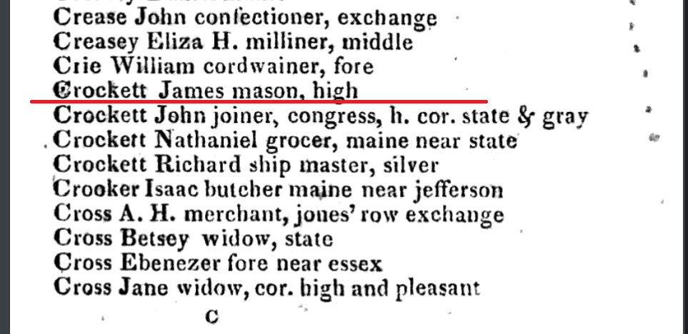 James Crockett was a mason from Gorham who was 34 years old when he purchased the land for our subject from Elias Thomas in 1820. Crockett paid $600 for the property in over 2 transactions. The 1823 city directory put him here. On March 4 of 1825 James signed his name to a deed selling our subject to Joseph Swift “Esquire” for $3600. 16 days later, James Crockett was dead. He was buried in Eastern Cemetery.