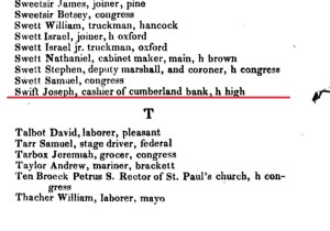 Joseph Swift was a bank ‘cashier’ for some 30 years. In the modern usage, a cashier is simply someone who takes your money when you purchase a product and any store. It’s usually a low paying, entry level, position. In the 19th century, a bank cashier was what we would call the bank manager. He, almost always he, was the person between the directors and the staff. Although not a position of great wealth and power, it did have it’s perks and usually paid a wage commensurate for someone in the upper-middle class of the day.