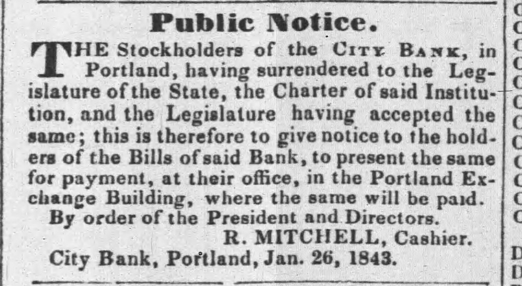 The City Bank was granted a charter by the Maine Legislature in March of 1836. A month later, the state deposited $200,000 into the bank as part of it’s share the surplus returned to the states by the federal government. In early the bank had received permission to increase it’s stock capital by $200,000. Things started well. By mid-1837, things were not so rosy. The annual state bank tax deadline was missed and a forbearance was requested and granted. The directors placed evermore ads in the local papers requesting capital installments from the stockholders. One has to wonder if Marshall French actually got his $5000 in hard currency.