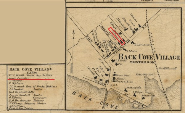 Isaac Sylvester came from Freeport. South Freeport and Porter’s, or Bartol’s, Landing to be exact. The neighborhood was alive with the sounds of ships being built in the 1850s and it was here that Isaac learned his trade. A deed of sale executed just before he bought the land for our subject would seem to point to this house as Isaac & Nancy Sylvester’s home. The buyer was a William G Brewer and his name appears on the 1857 Chace Map in that location.