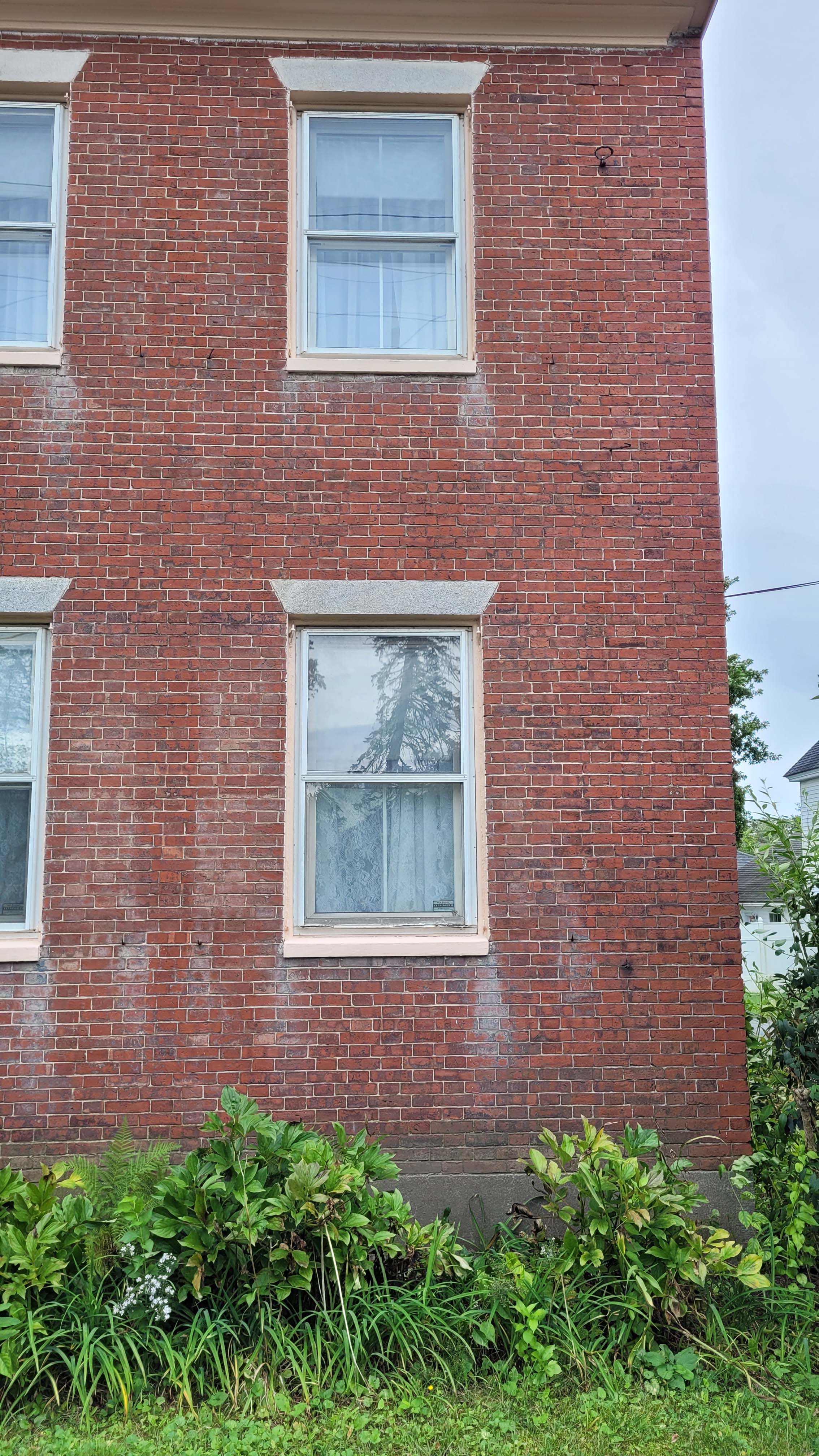 The house James Meader built could be called ‘chaste‘ to use an old term. It is substantial in size at 40′ on the street and 30′ deep and 2 full stories with some living space in the garret. A 2 story, wooden, ell measuring 20′ x 15’ projects from the northeast side. The main body is built of brick with openings simply cut into the surface. The windows have granite lintels and wooden sills. Side casings are minimal and there are remnants of shutters at all the windows. The wall is devoid of any projections but for window sills. The entry is a simple arched opening with fan light but no sidelights. The overall simplicity of the design and lack of ornament may have been a choice driven by the James and Content Meader’s beliefs as much as anything.