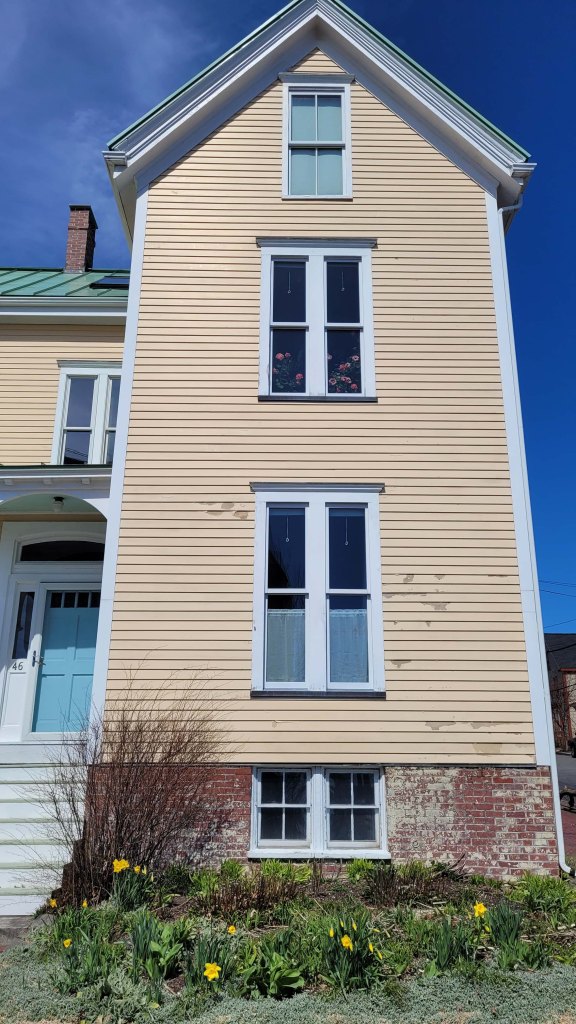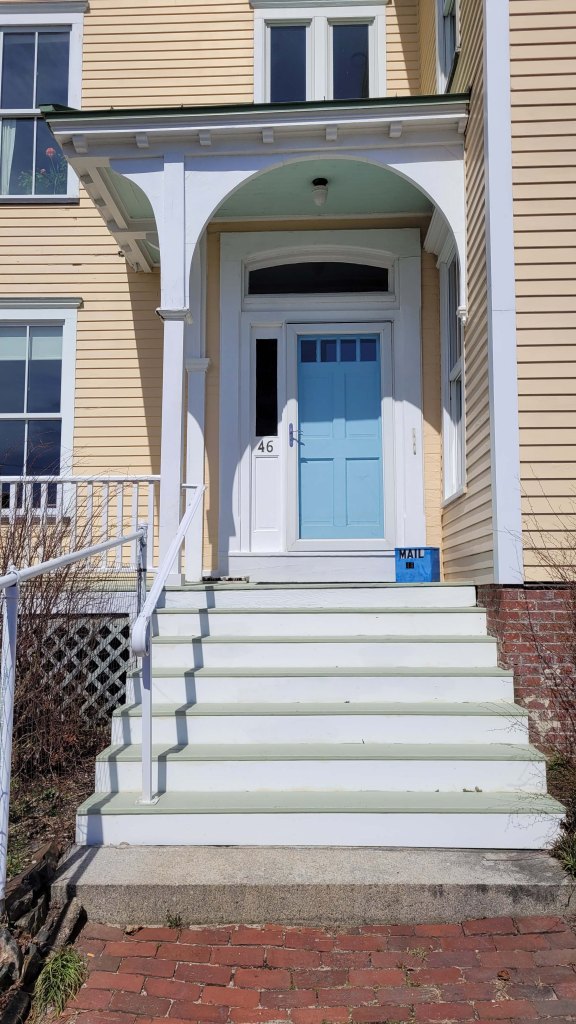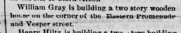 William purchased the land for our subject from William & Susan Boyd for $1000 in 1873. What William and Clara Gray had built measures 39′ on the Eastern Promenade and some 58′ along Vesper Street. It is 2 full stories with a 3rd in the garret. The windows are arranged in a functional manner. They have simple, square, casings with projecting, molding, caps. The only decoration of note is on the portico.
