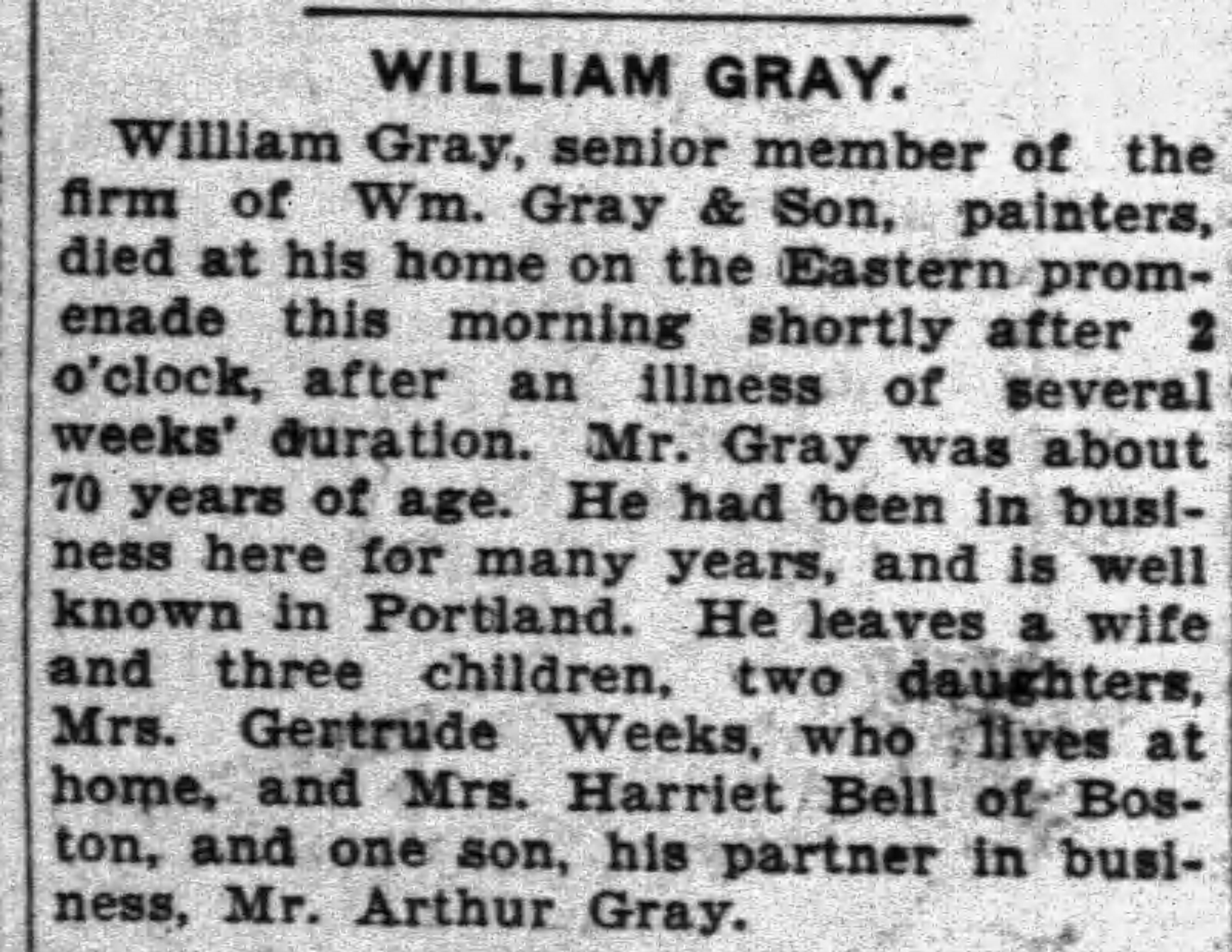 William Gray was a painter. He was the foreman of the Grand Trunk Railroad paint shop for several years before venturing out on his own. He worked on many buildings in the city as well as some passenger steamers. Newspaper articles mention his work on the Shailer School on North Street in 1881, the steamer ‘Lewiston’ built in 1876, the 2nd Congregational Church (demolished) on Congress Street in 1887 and the spire of the 1st Parish Congregational Church, also on Congress Street, in 1888.