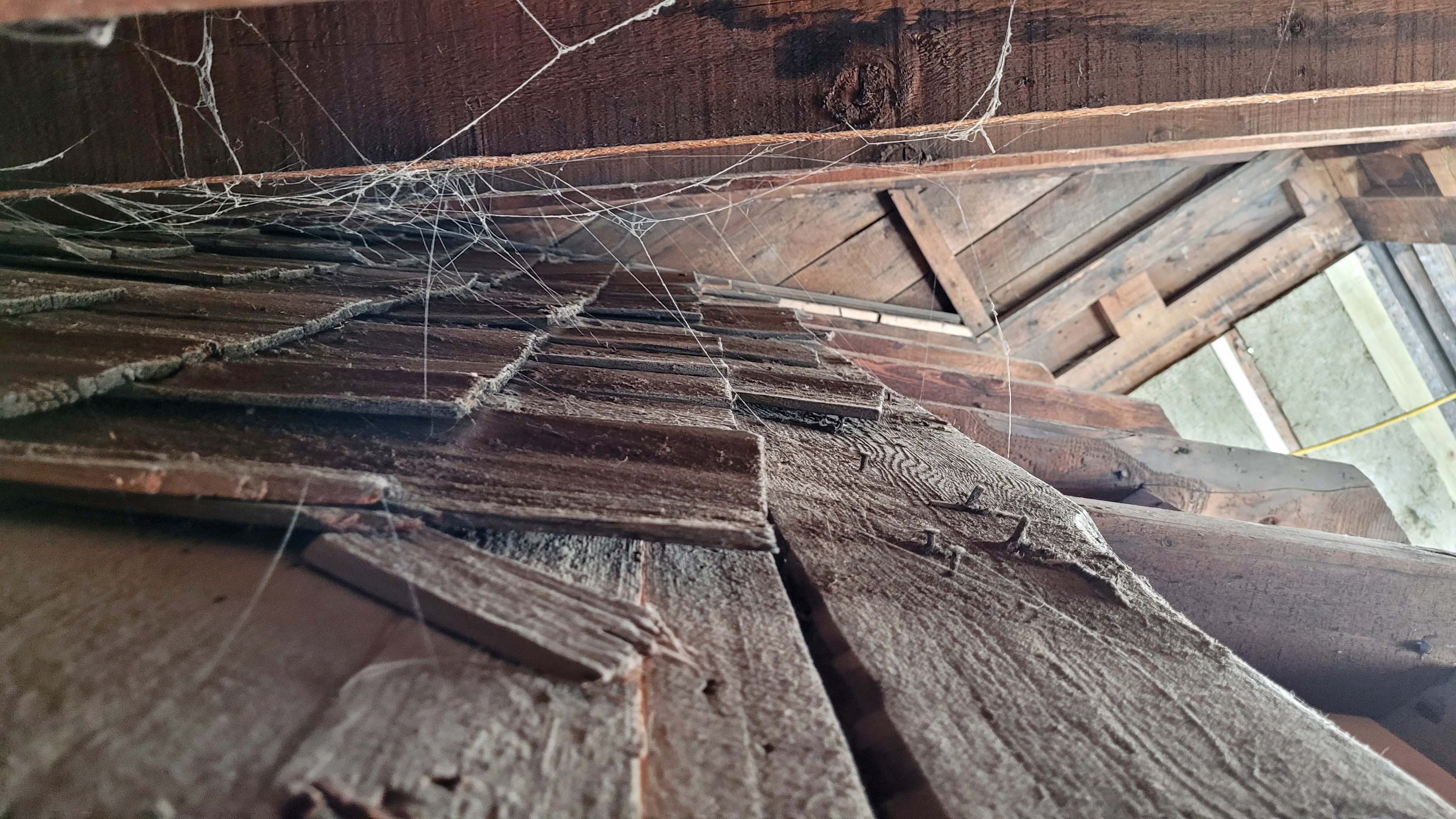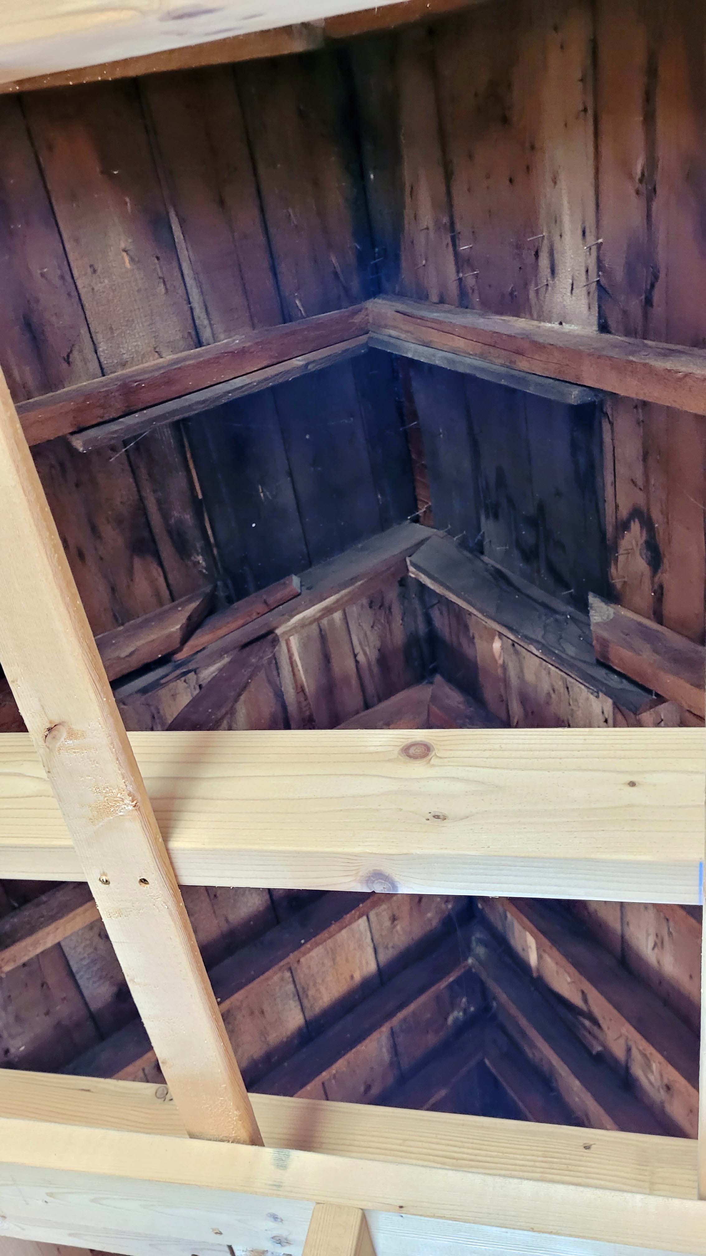 The small addition and bay on the eastern side is another, even later, addition that has it’s own issues. Also under-framed, even worse in fact, It utilized repurposed framing as noted by the alternating pattern of black and white seem on the image below. The span over the opening into the bay is carried by a timber that is to small and has sagged from the weight being carried. All of this will be restructured.