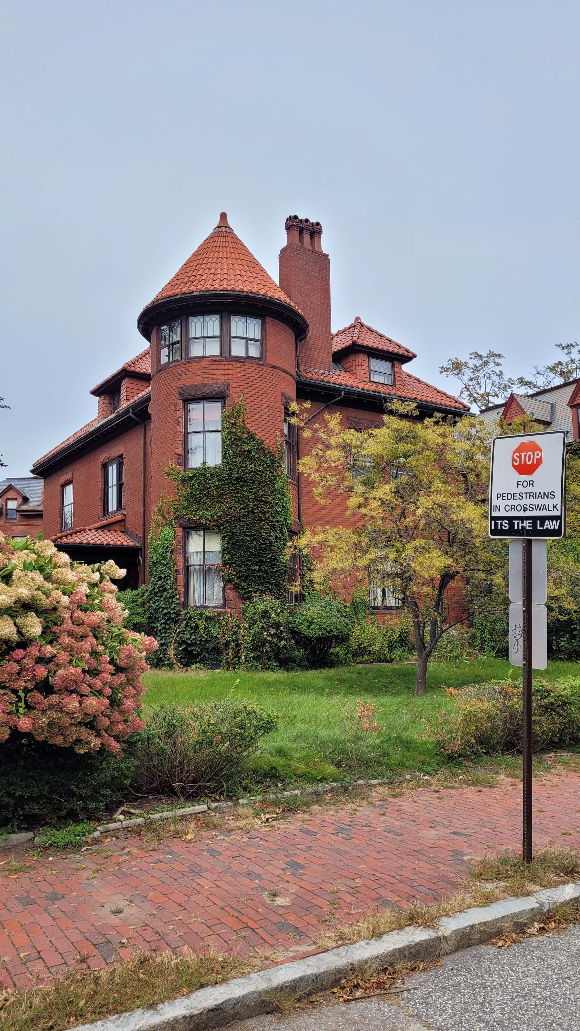 1 Thomas Street is peak Romanesque/Queen Anne for John Calvin Stevens. Built of common brick with a color matched mortar, the walls are planar surfaces only broken by window openings and a thin course of brownstone on the tower at the line of the cornice on the main block. The window openings are surrounded with brownstone. All of the walls and trim have been painted at some point in the past. The paint on the Thomas Street facade is still mostly there but the Spring Street facade, and turret, are blotchy. The windows, many of which appear to be original, are mostly common single-hung sash units. The windows in the upper level of the tower, the dormers, and the triple above the entry, have an arts-and-crafts motif in the upper panes. Then there’s the roof.