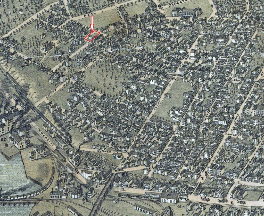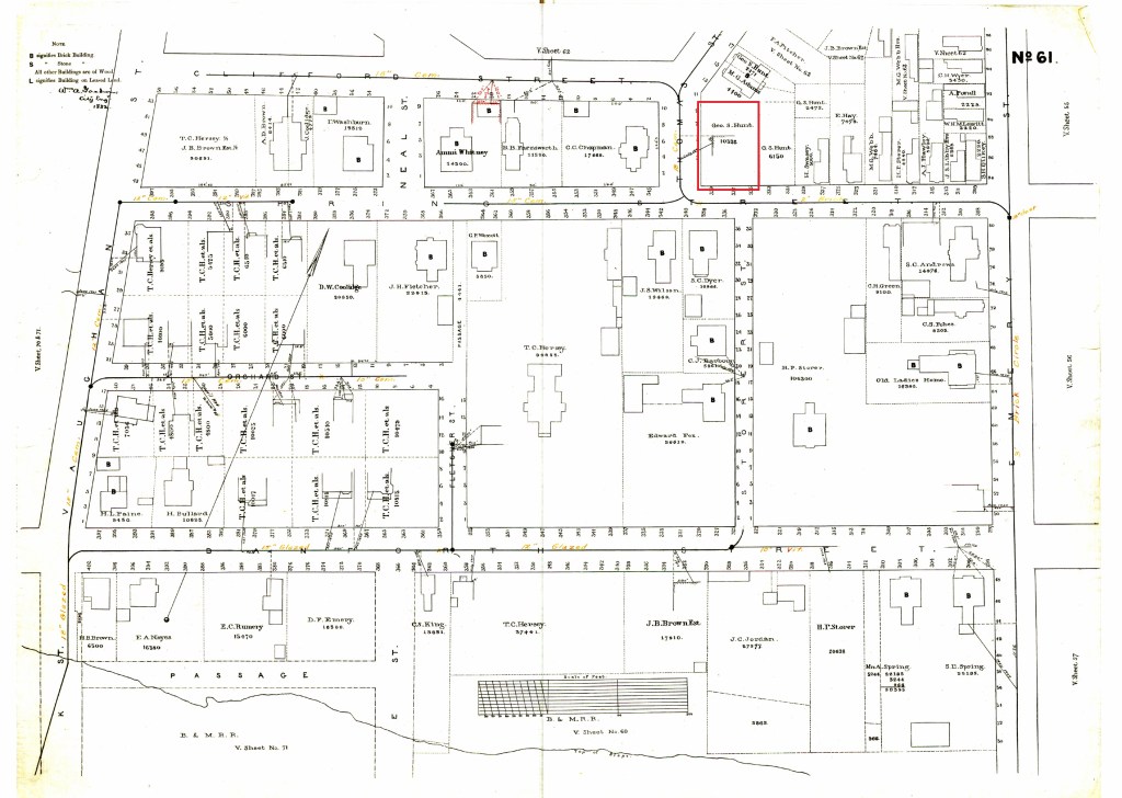 The land for 1 Thomas Street was purchased from John Bundy Brown by a merchant named George Hunt in 1865 as part of a larger parcel. The 1876 birds’ eye view would indicate there was something on the lot, but it seems to be gone by 1882. Maybe it was removed. Maybe it never existed.
