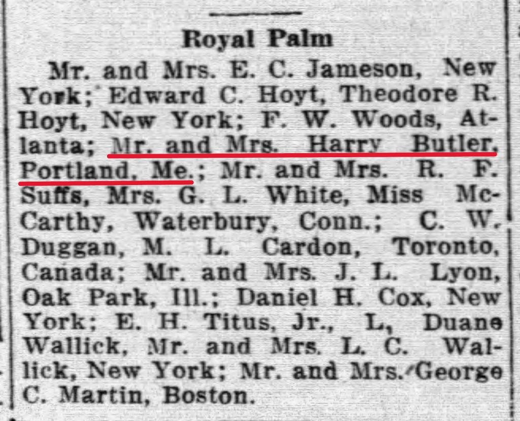 In 1919, the Butlers purchased a home in Miami, Florida as their winter residence. Newspapers in Maine & Florida had noted they had been spending time in the Miami area. They had stayed at the Royal Palm Hotel and the Halcyon Hotel. Harry was heavily invested in railroad stock so, it is possible he was an associate of Henry Flagler or at least knew of his development of South Florida as just the type of getaway area the Butlers were looking for. The Royal Palm was a Flagler property but the Halcyon was not.
