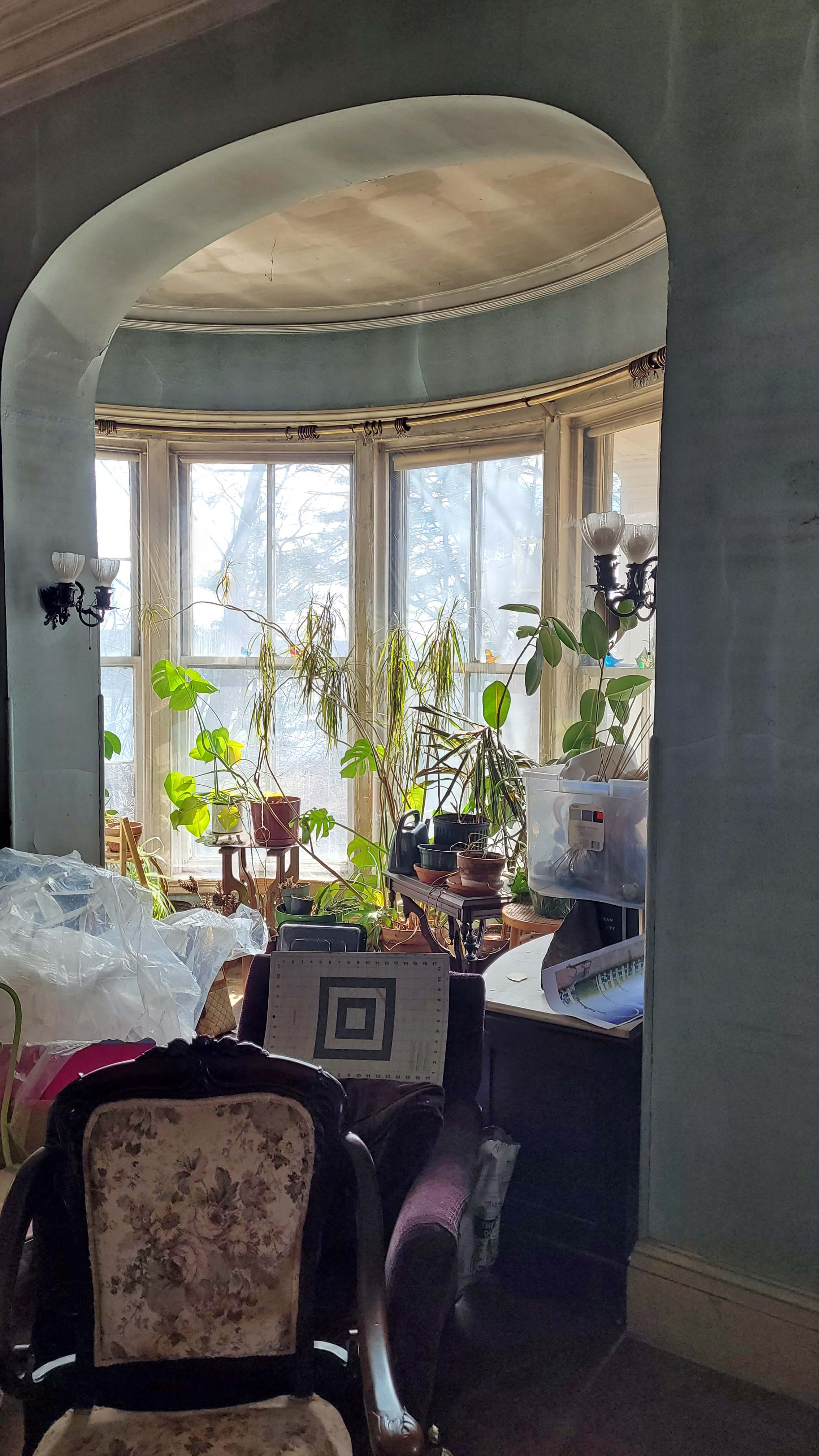 An interesting bay window in the large parlor. It runs beyond the wall creating a niche.