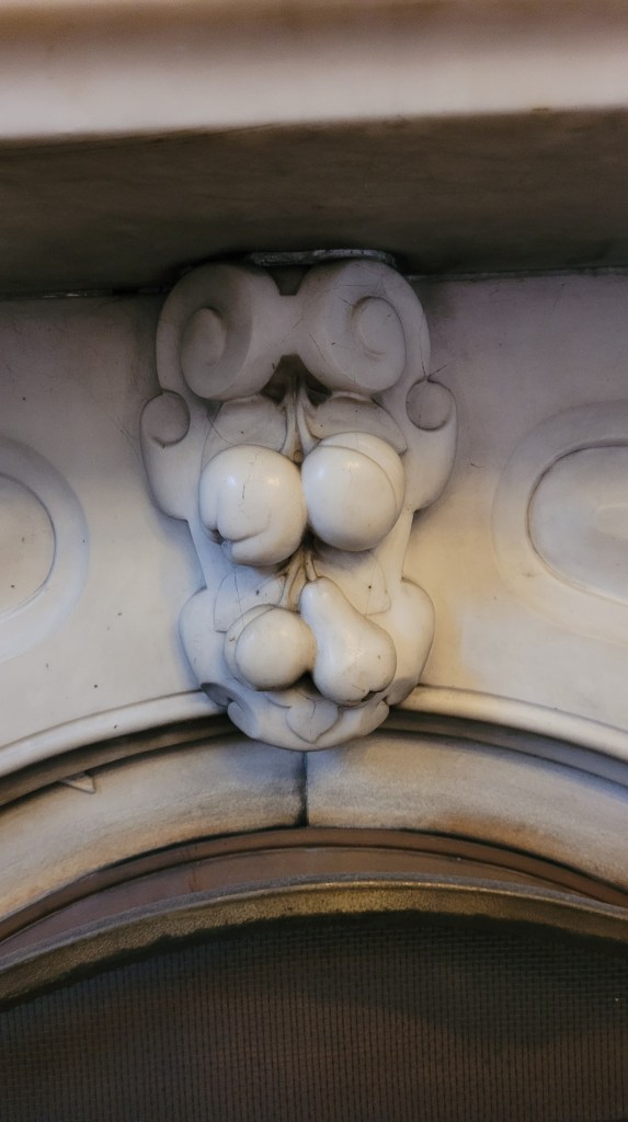 The fireplace in the formal parlor. I am not an expert on marble but, given the Springs wealth and prestige, I am willing to bet this is Carrara.