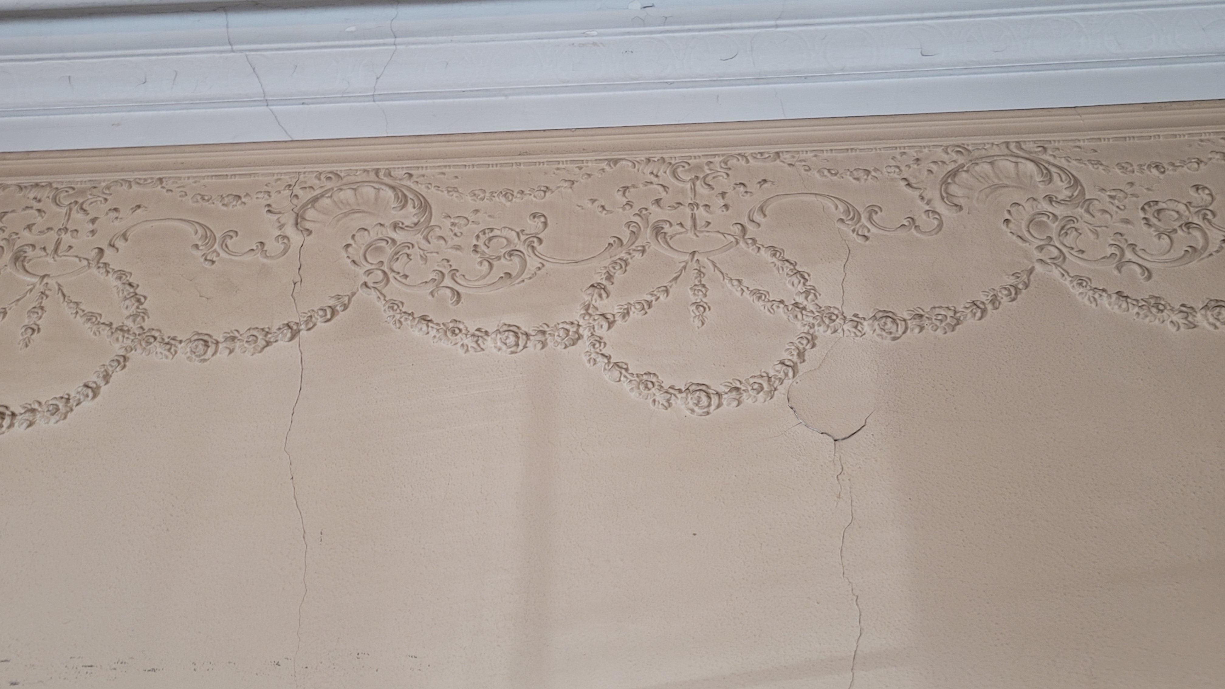 These molded garlands are in the front parlor only. I believe they are plaster as are the crown and ceiling moldings. There were a couple of plasterers in Portland in the period so the talent was here.
