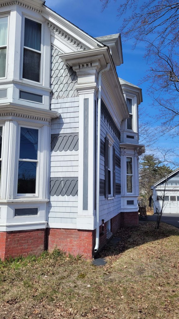 The bay on the south east, drive way, side carries the same proportions and, at first glance, seems better integrated than the front. But, it doesn’t fit the height of the wall in any way. It’s cornice is marooned in a sea of clapboard. The second floor window line is at the base of the architrave! It leads me to wonder, as on 296 Spring Street, are they original? Did the house that Peter and Armina build and live in even have bay windows? Were they added after Armina died? Wesley Galbraith was a carpenter. Did he add them? The masonry of the foundations are nearly identical but the bay is separated from the main block so that doesn’t say yes or no. My guess is they are not original. They weren’t common for the style and period. But, it’s a guess. In the end, it is a puzzlement.