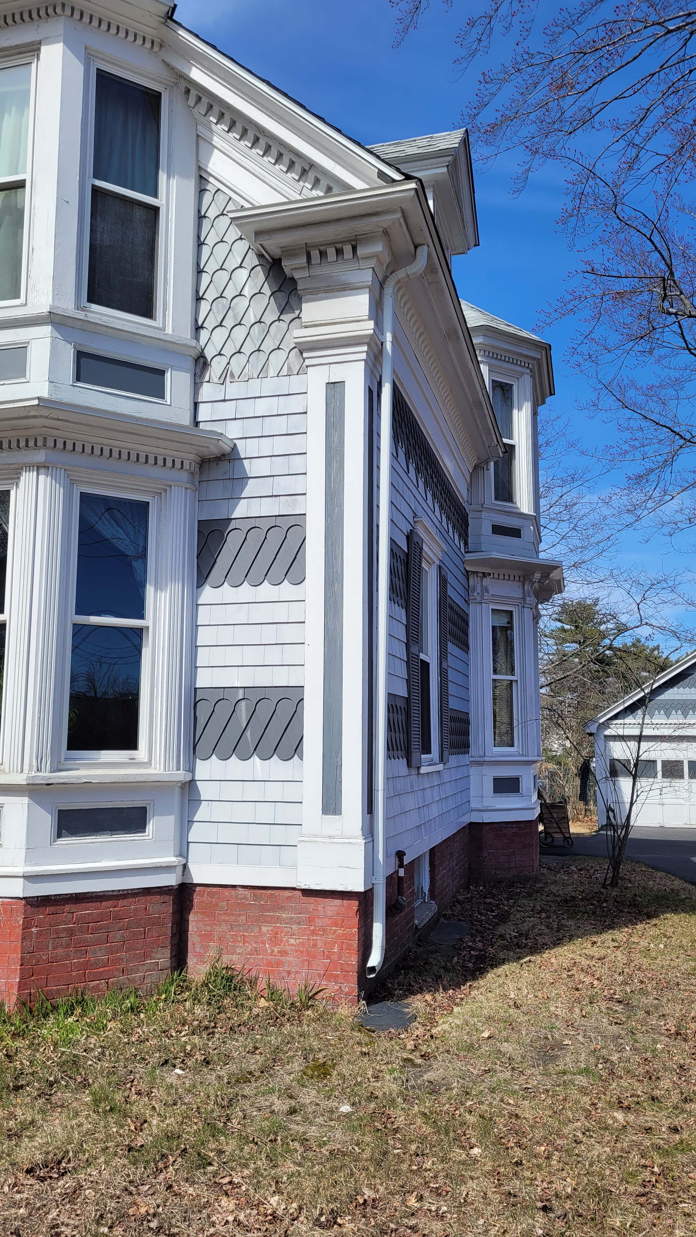The bay windows on 1043 Congress Street are odd things. The front bay seems pretty ‘normal’ at first but, when studied, we discover that it doesn’t fit the building it is on. The cornice line cuts into the roof line of the main house and is higher than the roof. That has to be a source of leaks. Also, the bay is too wide. It is uncomfortably placed between the corner pilaster and the entrance. The current porch and steps are crammed against it in a less than optimal manner.