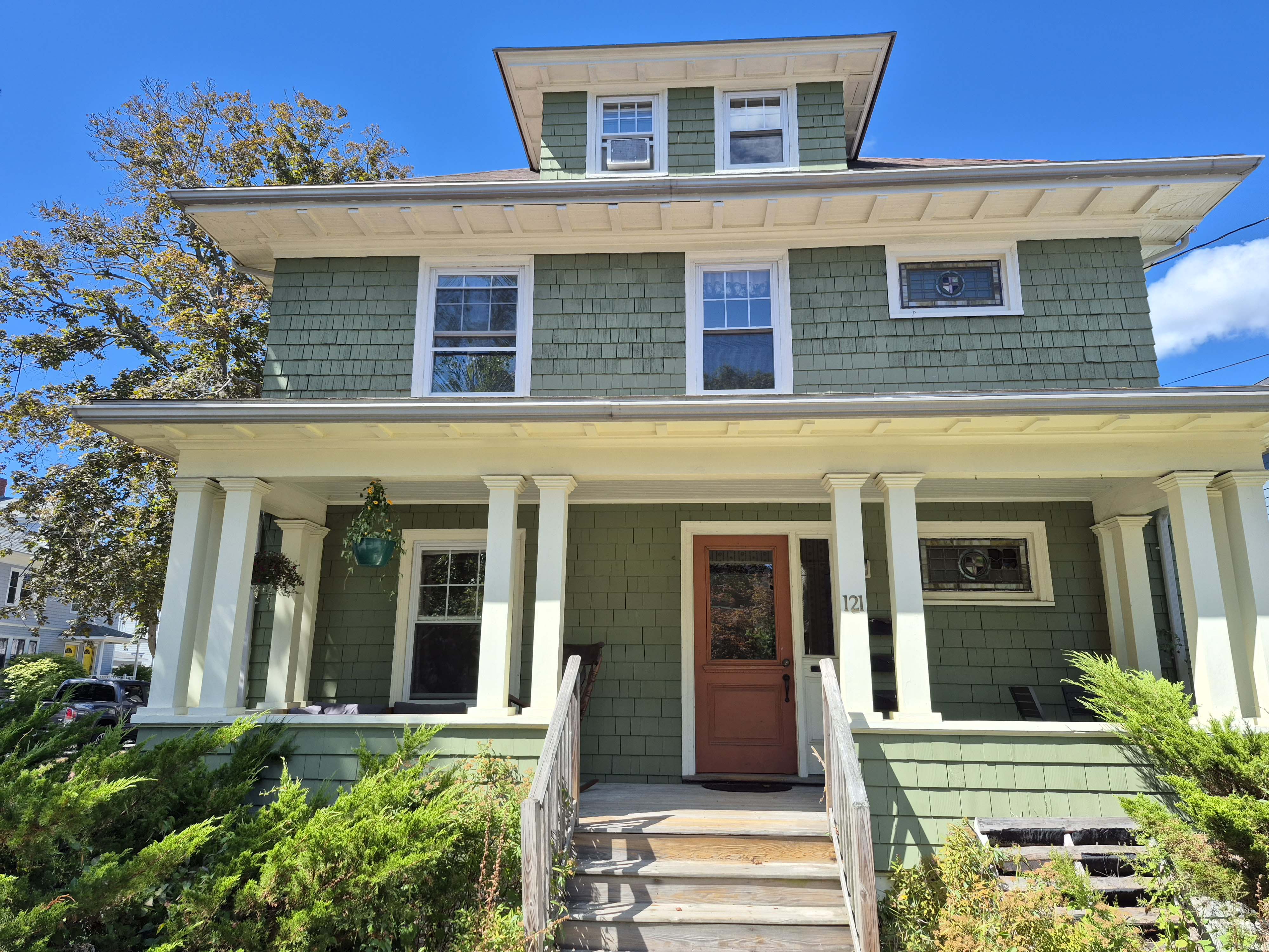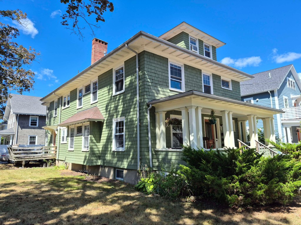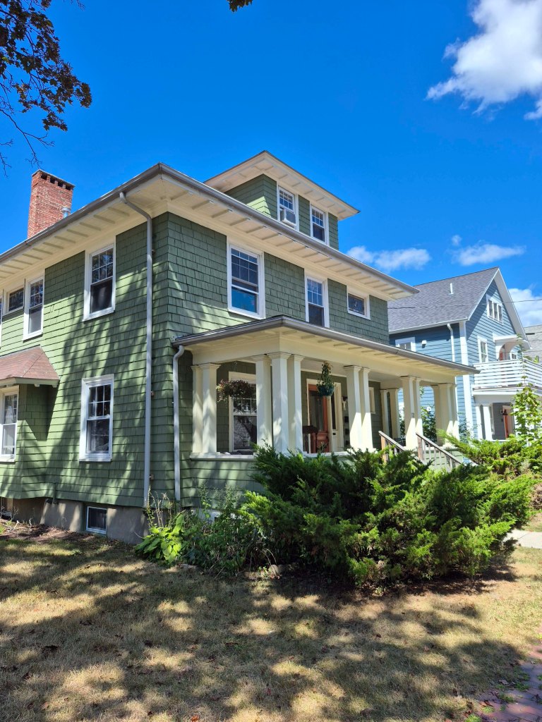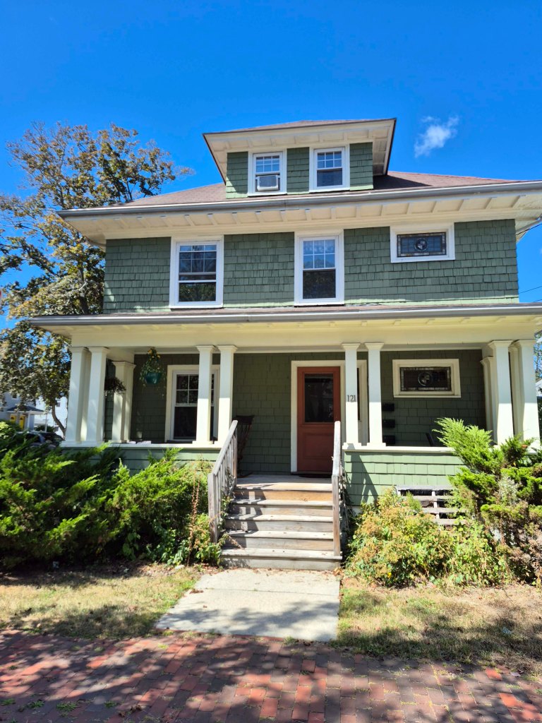 121 Dartmouth Street measures 28′ wide on the facade and is 50’s deep. It is 2 stories with a third in the attic. Current tax records, along with gas and electrical meters show the house to be a 3 family with one on each floor. The floor plans for the primary levels are, most likely, central hall with kitchen, living room, & dining room on one side, in this case facing Oakdale Street, and 3 bedrooms & a bath on the other side. The short windows on the front are the stairway. Speaking of that short window.