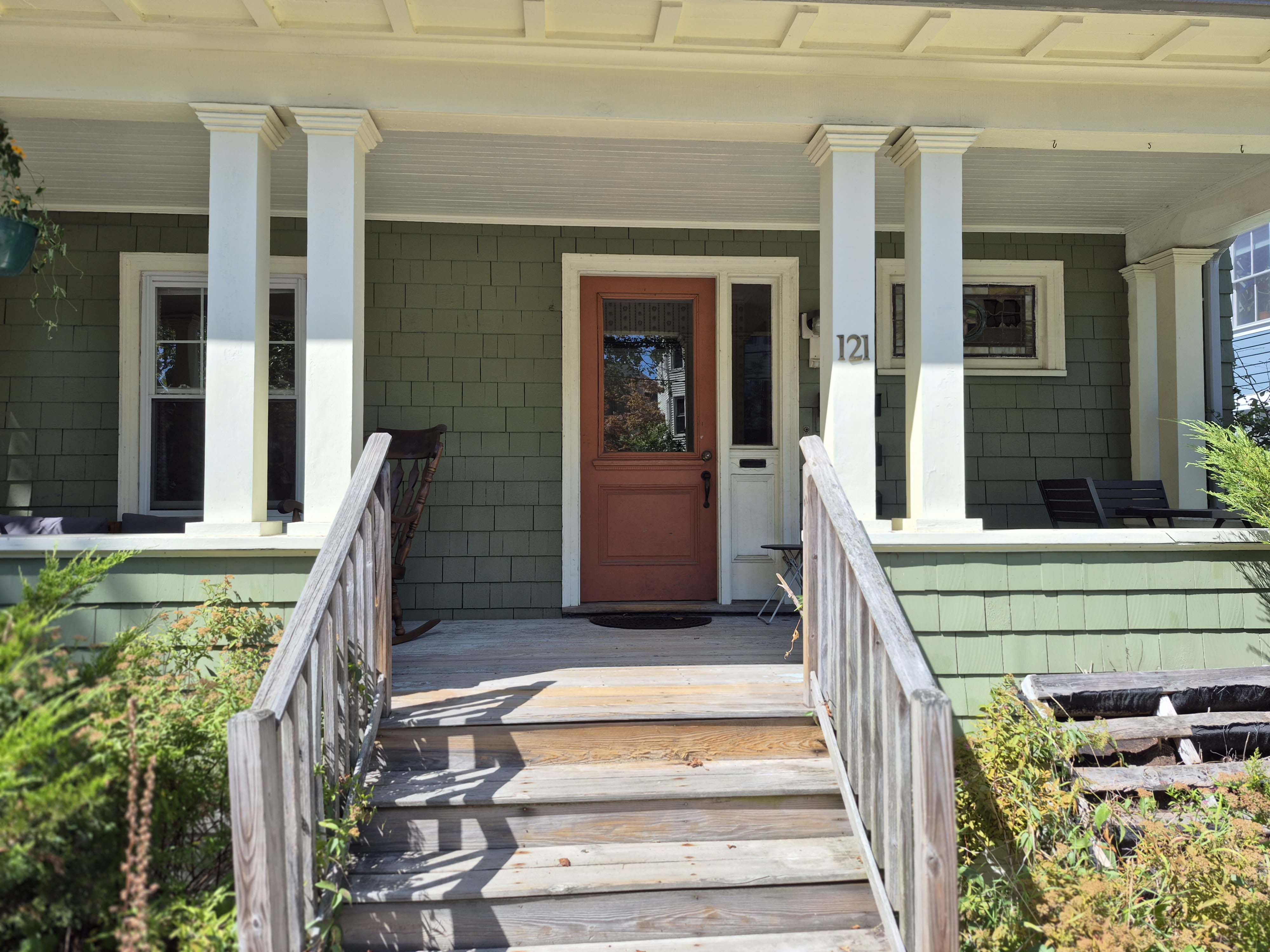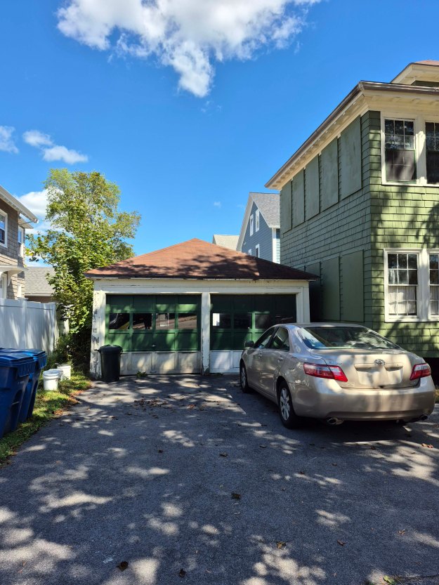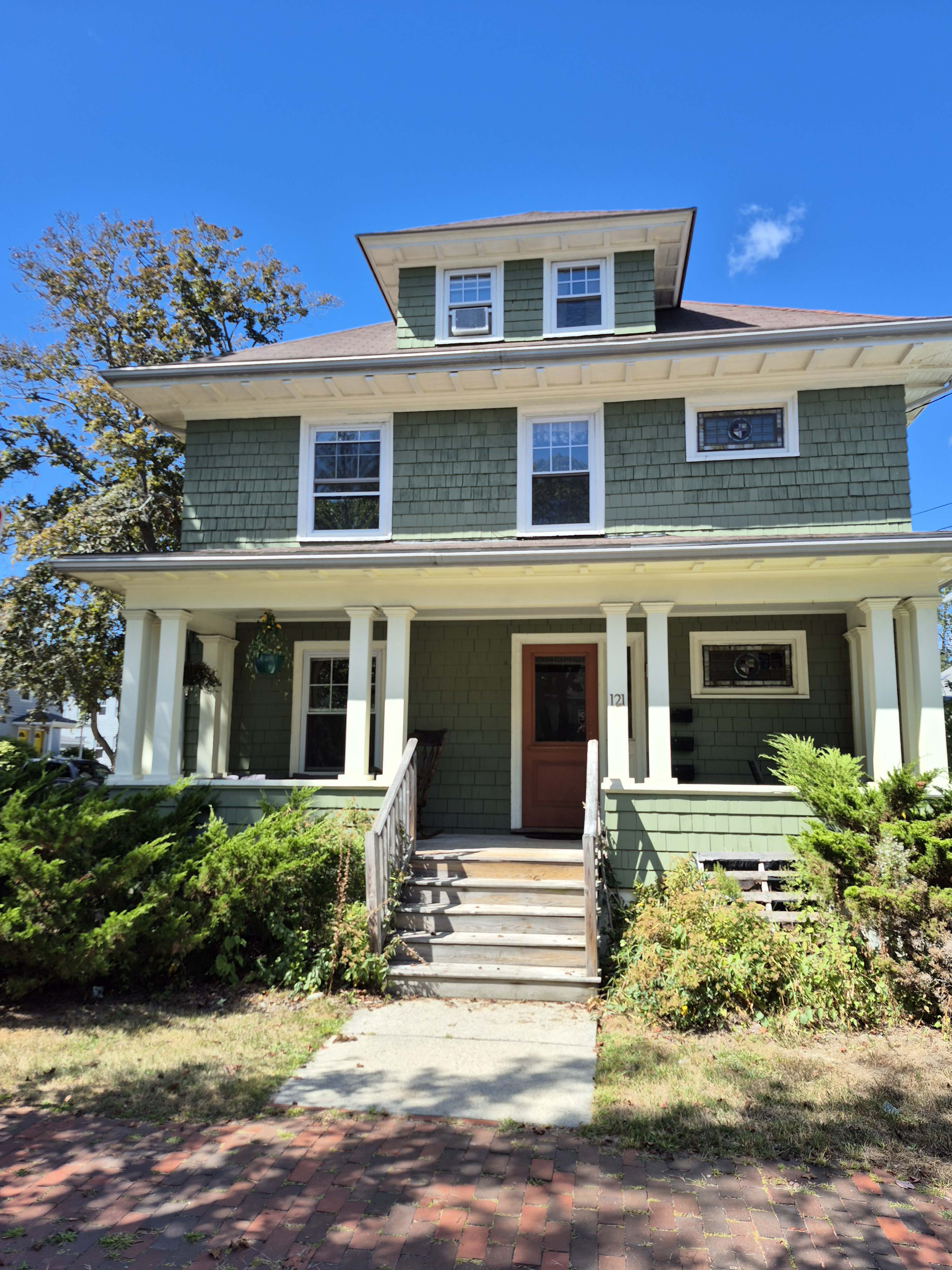 121 Dartmouth Street measures 28′ wide on the facade and is 50’s deep. It is 2 stories with a third in the attic. Current tax records, along with gas and electrical meters show the house to be a 3 family with one on each floor. The floor plans for the primary levels are, most likely, central hall with kitchen, living room, & dining room on one side, in this case facing Oakdale Street, and 3 bedrooms & a bath on the other side. The short windows on the front are the stairway. Speaking of that short window.
