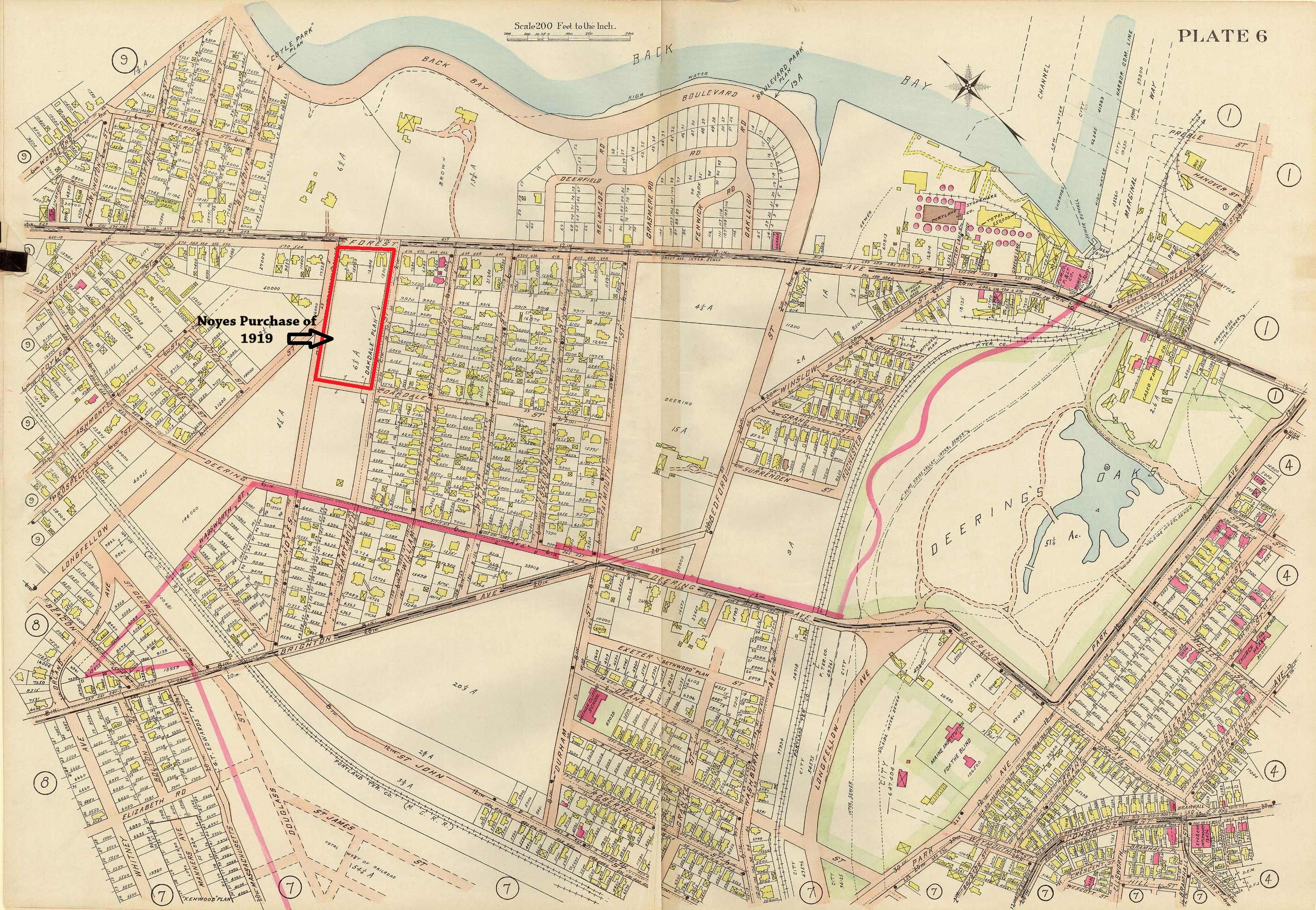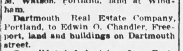 Dartmouth Street first appears in 1880 when the Deering heirs started to divide the larger holdings of James Deering. The segment of Dartmouth containing our subject was part of a section sold to the Dartmouth Real Estate by Marion Deering Noyes and others in 1919. They platted it and started building. At the same time they purchased the land, the Dartmouth Real Estate Company took out 11 mortgages with the Maine Savings Bank totaling $69,300 all payable in one year at 6% interest. Some of these were collateralized with houses in other parts of Portland, some of which look familiar, and others were taken on ‘existing’ houses here in the block. Only 2 of the 11 mortgages were paid off within the prescribed year with the last , and largest, not being satisfied until late September of 1924.