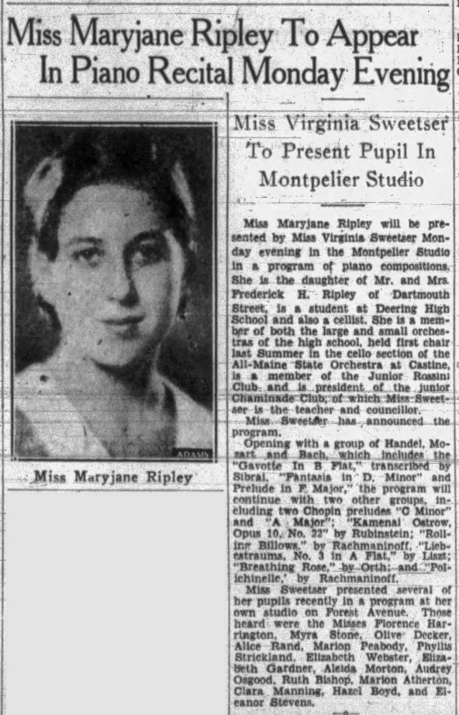 By the early 1930s, Frederick & Mary Ripley’s eldest daughter, Virginia, had moved to Boston and Maryjane was in high school. Maryjane went to college and moved to Brookline MA after graduating. The 1940 Census found Frederick and Mary living above Lloyd & Blanche Kimball and their daughter Blanche. Lloyd was a traveling salesman for a wholesale foundry supply company.